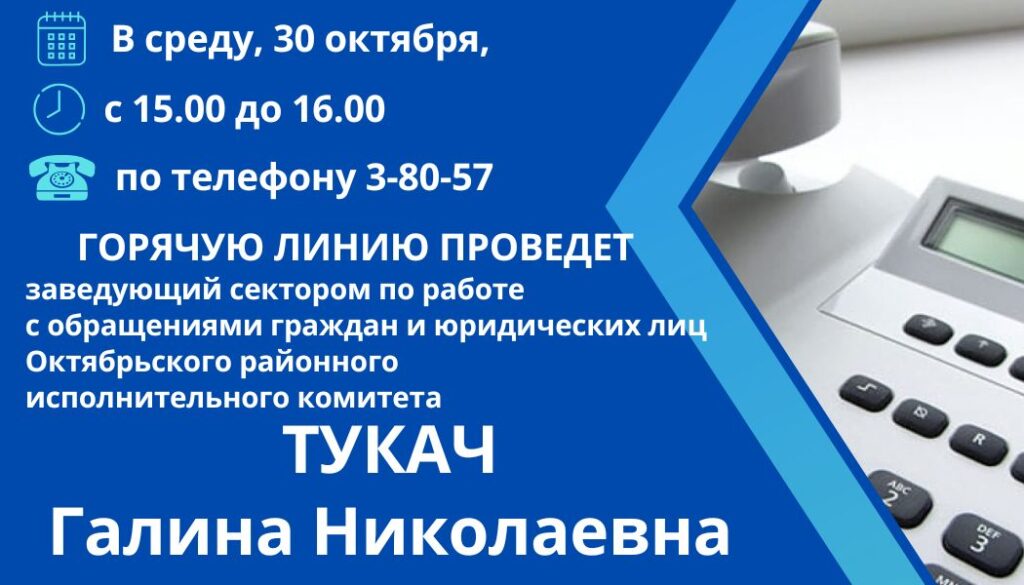 Заведующий сектором по работе с обращениями граждан и юридических лиц Октябрьского райисполкома Галина Тукач проведет горячую линию Прямая линия 28 Окт 2024 1820