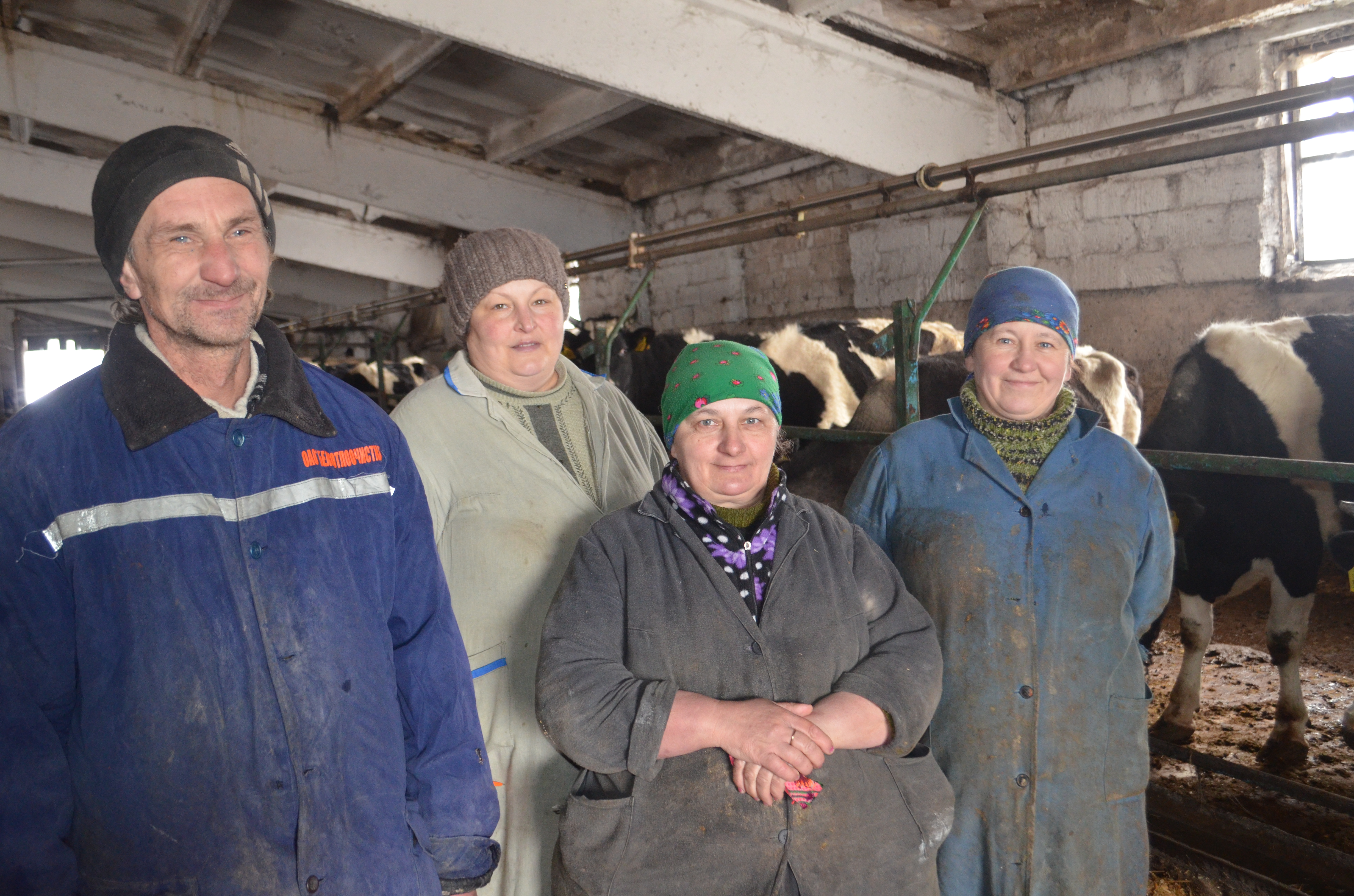 (слева направо):бригадир Сергей Романовский, техник-осеменатор Светлана Луцкович, телятница ЖаннаЛагуто, оператор машинного доения Наталья Самойленко.